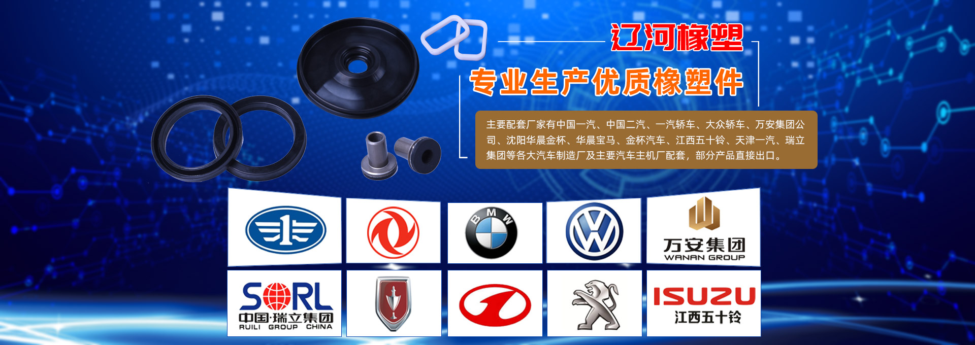 遼河集團(tuán)主要生產(chǎn)各類(lèi)汽車(chē)三角窗密封條、O形圈、油封、皮膜、皮碗、減震系列等各類(lèi)橡塑密封件和汽車(chē)用橡膠制品,公司銷(xiāo)售網(wǎng)點(diǎn)遍布全國(guó)各地,目前已經(jīng)為全國(guó)各大汽車(chē)制造廠(chǎng)及主要汽車(chē)主機(jī)廠(chǎng)配套各種橡膠制品。